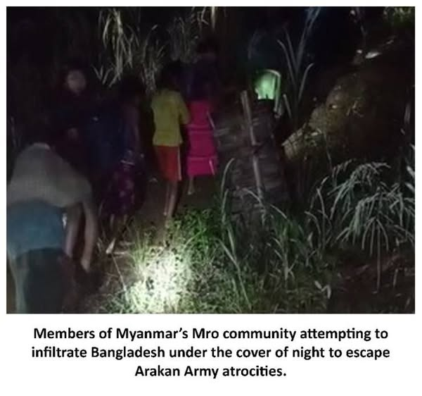 While ULA points the finger at BGB, the AA itself is facing deepening crises in northern Maungdaw. Prolonged conflict has eroded morale within its ranks. Fighters are disillusioned by involvement in narcotics trade, disputes over looted resources and psychological fatigue. Many have deserted, leaving manpower gaps that AA tried to fill with recruits from other ethnic groups of Rakhine State. But language barriers, poor knowledge of terrain and reluctance to fight have reduced their effectiveness, creating new coordination problems. Food shortages in nearby Buthidaung have worsened the situation, prompting Rohingya civilians to attempt crossing into Bangladesh. In one striking case, an AA lieutenant reportedly defected and surrendered inside Bangladesh—an indicator of the group’s weakening cohesion. The Arakan Army’s abuses are not confined to the Rohingya population alone. Smaller ethnic minorities such as the Mro and the Tanchangya have also been subjected to persecution. Even members of the Rakhine community who refuse to pay extortion money to the AA face intimidation, violence, and harassment. Many among these groups, unable to endure the pressure, have fled across the frontier and taken shelter inside Bangladesh. Pictures of the aforementioned incidents are appeared below to substantiate the phenomena.
