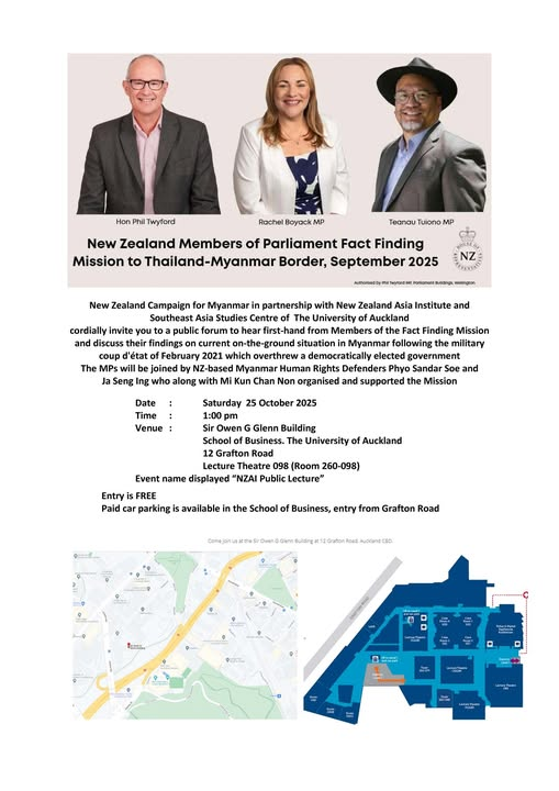 o After meeting with over 30 of our pro-democracy groups on the Thai-Myanmar border, three NZ MPs are now pushing their government to formally “reject the sham election”.