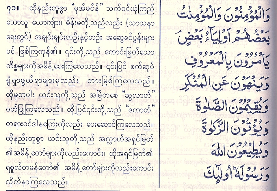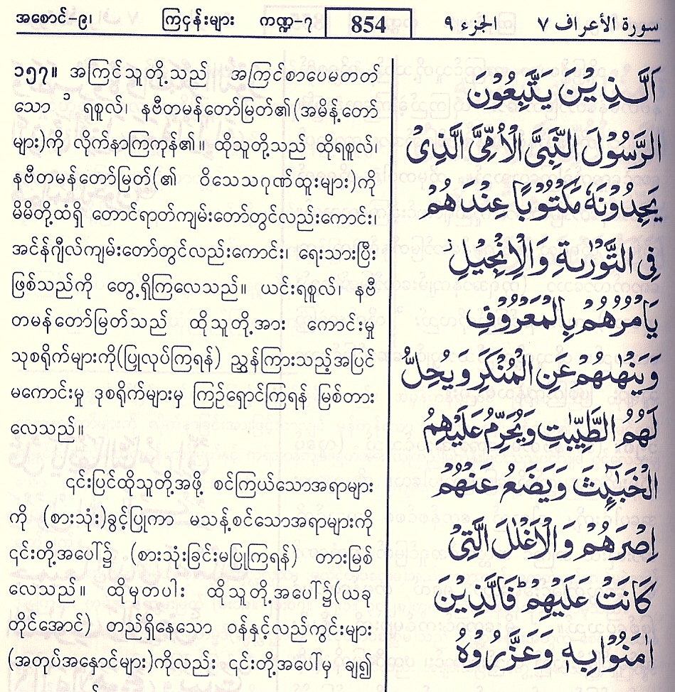 “Those who follow the apostle, the unlettered Prophet, whom they find mentioned in their own (scriptures), – in the law and the Gospel; – for he commands them what is just and forbids them what is evil; he allows them as lawful what is good (and pure) and prohibits them from what is bad (and impure); He releases them from their heavy burdens and from the yokes that are upon them. So it is those who believe in him, honour him, help him, and follow the light which is sent down with him, – it is they who will prosper.”