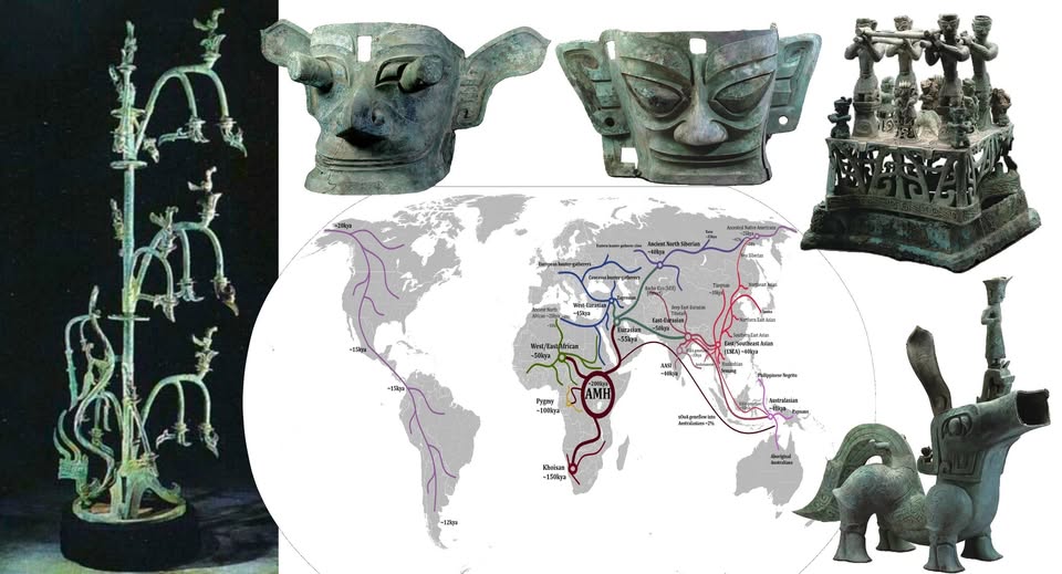 ■ စီချွမ်ပြည်နယ် ချန်ဒူးမြို့မြောက်ဘက် Sanxingdui မှာ ဘီစီ ၄ ထောင်စုကနေ ဘီစီ ထောင်စုနှစ်ဦးအထိ ( လွန်ခဲ့သော နှစ် ၅၀၀၀ ကျော်ခန့်ကနေ နှစ် ၃၀၀၀ ဝန်းကျင် ) ထွန်းကားခဲ့သော အလွန့်အလွန် ရှေးကျသည့် ကြေးခတ်ယဥ်ကျေးမှု လူ့အဖွဲ့အစည်း၏ သက်သေအထောက်အထားတွေကို အစုလိုက်အပြုံလိုက် တွေ့ရတယ်။ အဆိုပါ စီချွမ်ချိုင့်ဝှမ်းရှိ ကြေးလက်ရာ, Artifacts များသည် မြစ်ဝါမြစ်ဝှမ်း ရှေးဦးတရုတ်လူ့အဖွဲ့အစည်း ဖြစ်ထွန်းမှုနှင့် ဆက်စပ်မှု လုံးဝမရှိပဲ သီးခြားဖြစ်သော ယဥ်ကျေးမှုဖြစ်နေတယ်။