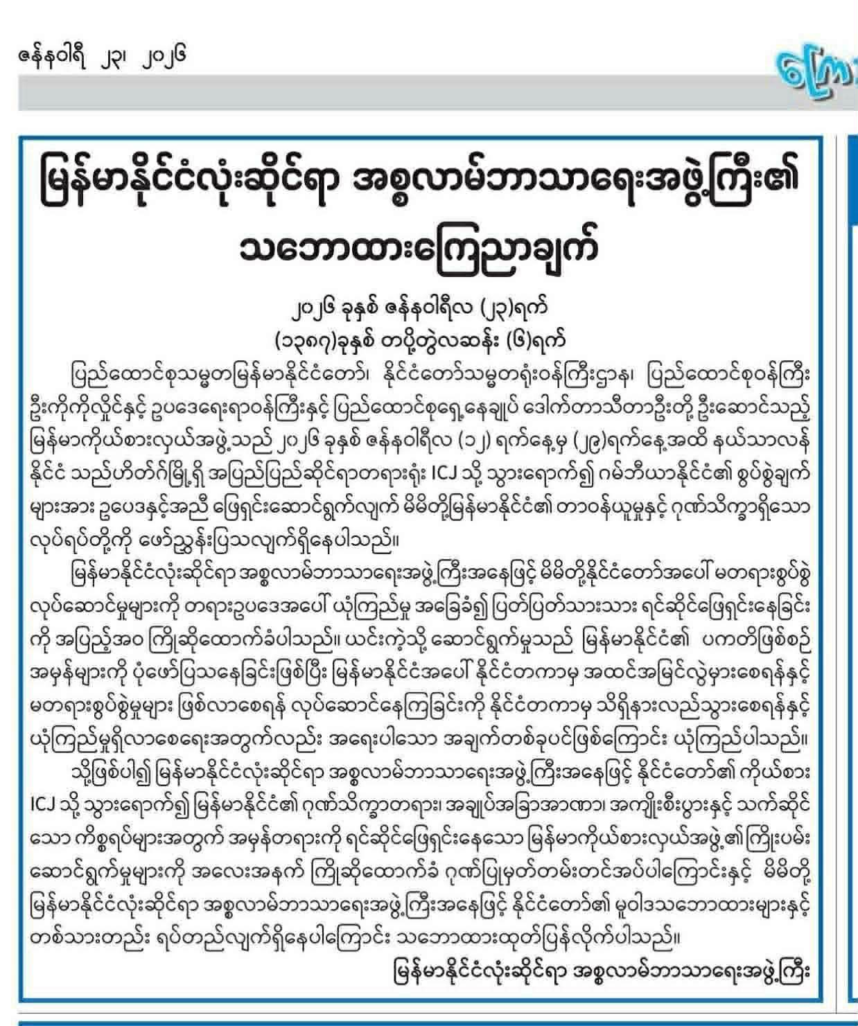 အထက်ပါ အဖွဲ့ ၅ဖွဲ့ ရဲ့ ICJ အမှုနဲ့ပတ်သက်လို့ စစ်အာဏာရှင်တွေဖက်က ရပ်တည်ထုတ်ပြန်မှု စာသားတွေဟာ သမိုင်း မှတ်တမ်းဖြစ်ခဲ့ပါပီ ။