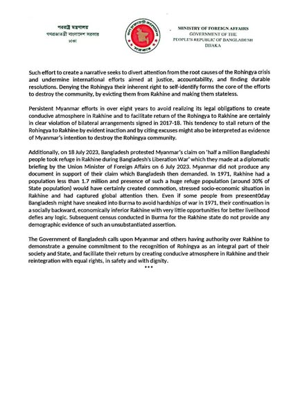 The government also recalled its protest on July 18, 2023, against Myanmar’s unsubstantiated claim that half a million Bangladeshis took refuge in Rakhine during Bangladesh’s 1971 Liberation War, noting the absence of any documentary or demographic evidence.