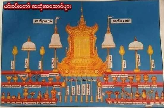 ** မြေနန်းတော်မှာ ဘုရင် ညီလာခံရင် ပလ္လင်တဘက် တချက်က အစီအရီထားတဲ့ ကွမ်းလောင်း၊ ကွမ်းခွက်၊ ကွမ်းချပ်၊ စလင့်ကြာ၊ ထွေးခံ၊ ရွှေဖလား၊ တကောင်း၊ မြူတာ၊ကျပ်လျား၊အိုးပြစ်၊ပြတို့၊ဒေါင်းပေါင်၊မကန်းကရား၊ မုနောလင်ပန်း၊ သလင်းမြောင်၊ ရတနာပန်းတောင်း၊ ခြေနင်း၊ ဖိနပ်၊ သားမြီးယပ်၊ သန်လျက်၊ တောင်ဝှေး၊ မေးထောက် စတဲ့ ရှေးမင်းအသုံးအဆောင် ပစ္စည်းတွေ ဖြစ်ပြီး ဘုရင် သွားလေရာကို ယူသွားရတယ် လို့လည်း ဆိုပါတယ်။ဒီခွက်တွေ အုပ်တွေကို ရွှေနဲ့ ကျောက်မျက် ရတနာတွေစီချယ်ထားပြီး လက်ဝဲလက်ယာ ၃၅ မျိုးထိ ရှိတာပါ။ **