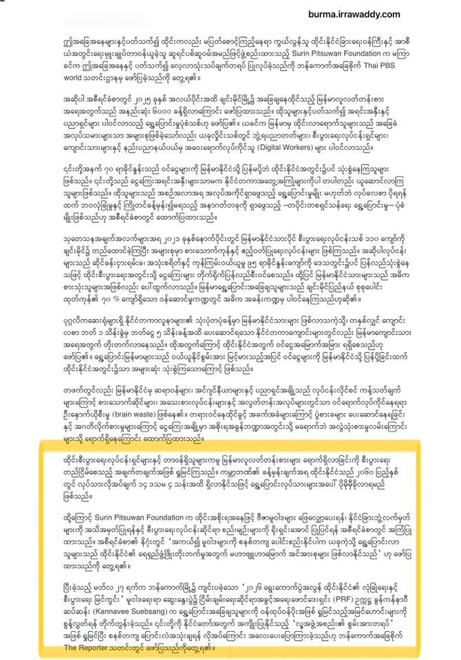 ထိုင်းအစိုးရက မြန်မာပြည်မှာ မနေနိုင်လို့ ယိုစီးထွက်လာတဲ့ ဦးနှောက်တွေနဲ့ ငွေကြေးအရင်းအမြစ်တွေဟာ “ထိုင်းနိုင်ငံ၏ ရေရှည်ဖွံ့ဖြိုးတိုးတက်မှုအတွက် မဟာဗျူဟာမြောက် အင်အားစုများ ဖြစ်လာနိုင်တဲ့အတွက် ထိုင်းနိုင်ငံတော်အတွက် အကျိုးပြုနိုင်သည့် “လူ့အဖွဲ့အစည်း၏ စွမ်းအားတရပ်” အဖြစ် ရှုမြင်ပြီး စနစ်တကျ ပြောင်းလဲအသုံးချရန် လိုအပ်ကြောင်း”ကို