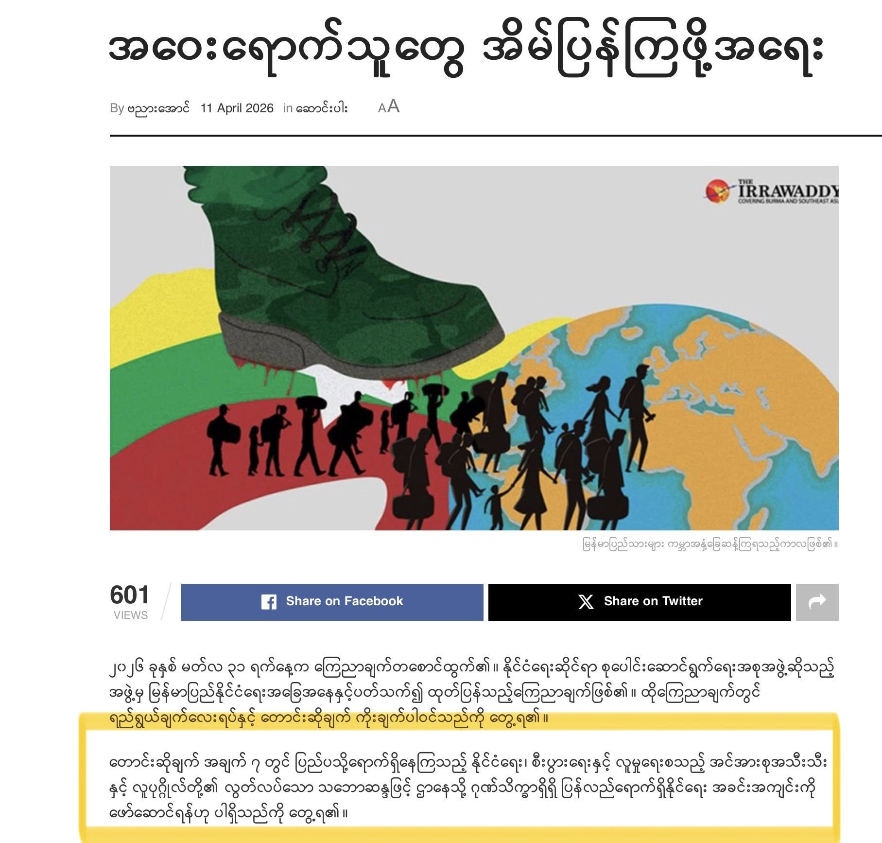 ပြီးခဲ့သည့် မတ်လ ၂၇ ရက်က ဘန်ကောက်မြို့၌ ကျင်းပခဲ့သော “၂၀၂၆ ရွေးကောက်ပွဲအလွန် ထိုင်းနိုင်ငံ၏ လုံခြုံရေးနှင့် စီးပွားရေး မြင်ကွင်း” မူဝါဒရေးရာ ဆွေးနွေးပွဲ၌ ငြိမ်းချမ်းရေးဆိုင်ရာအခွင့်အရေးဖောင်ဒေးရှင်း (PRF) ဥက္ကဋ္ဌ ခွန်ကန်နာဝီ ဆပ်ဆန်း (Kannavee Suebsang)က ပြောကြားခဲ့တယ်လို့ ဆိုပါတယ်။