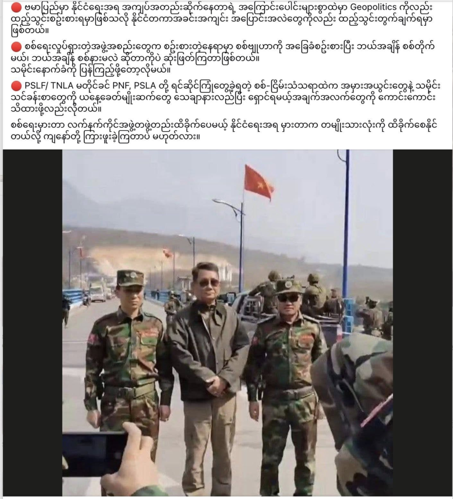 Ko Kyaw Ko Ko approaches the crisis from a different angle, focusing on the PSLF/TNLA’s decision to send a congratulatory message to Senior General Min Aung Hlaing. He identifies three layers of response in the public discourse that followed: