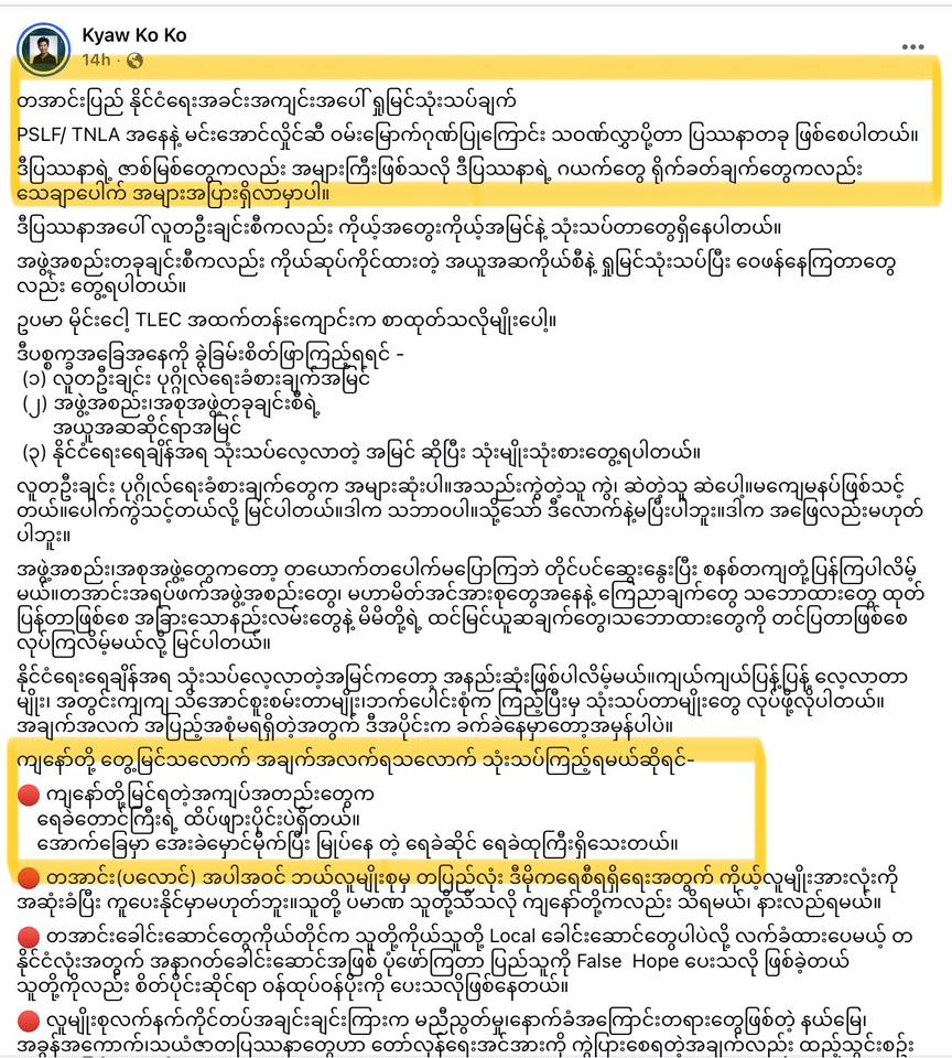 🔴 တအာင်းခေါင်းဆောင်တွေကိုယ်တိုင်က သူတို့ကိုယ်သူတို့ Local ခေါင််းဆောင်တွေပါပဲလို့ လက်ခံထားပေမယ့် တနိုင်ငံလုံးအတွက် အနာဂတ်ခေါင်းဆောင်အဖြစ် ပုံဖော်ကြတာ ပြည်သူကို False Hope ပေးသလို ဖြစ်ခဲ့တယ်